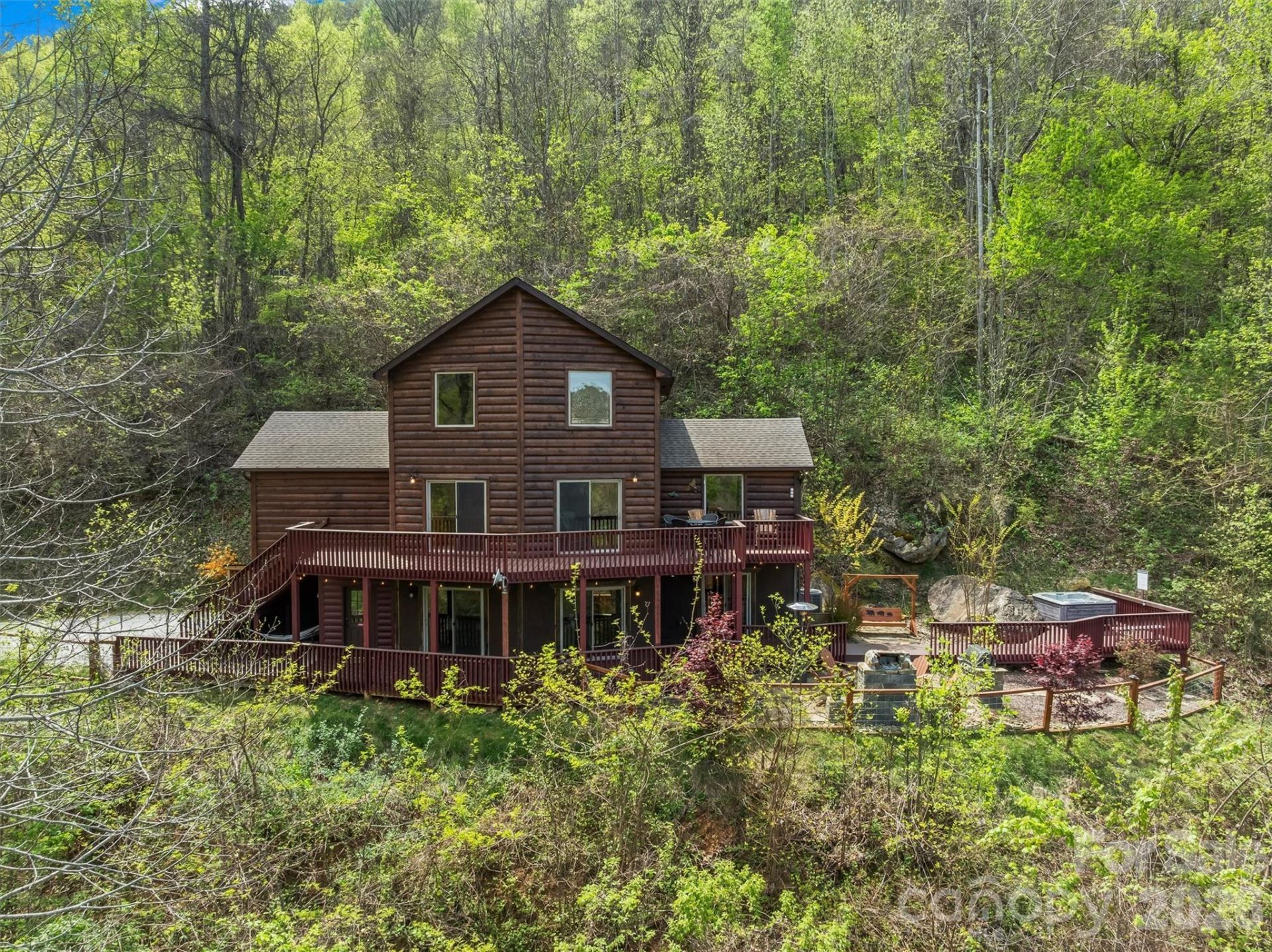 Mountain views and mountain charm come together in this inviting log home featuring 3 bedrooms and 2.5 bathrooms across a thoughtfully designed 1.5-story layout with a finished basement. The main level offers a spacious primary bedroom with an en-suite bath, along with a comfortable living room and lounge area centered around a cozy gas log fireplace. The upper-level features two additional bedrooms and a full bathroom, ideal for family or guests. The lower level expands the living space with a large recreation room, dining area, half bath, and a bonus room currently used for additional sleeping, providing excellent flexibility. Enjoy the convenience of a 1-car attached garage with an EV charging station. Step outside to your own outdoor oasis, complete with a hot tub, swing, firepit, and grilling area?all perfectly positioned to take in the mountain views. A great option for a full-time home, second home, or investment.